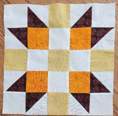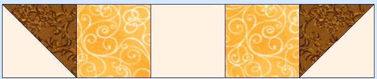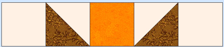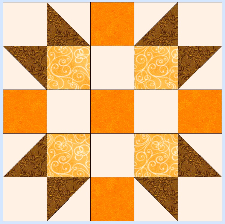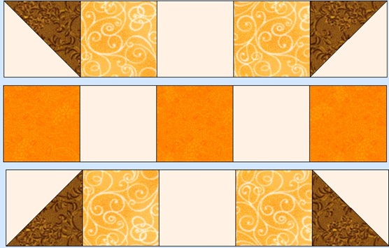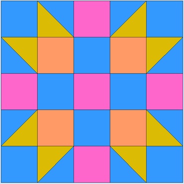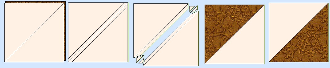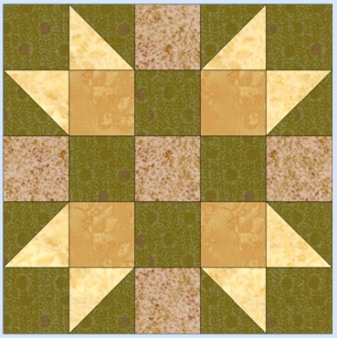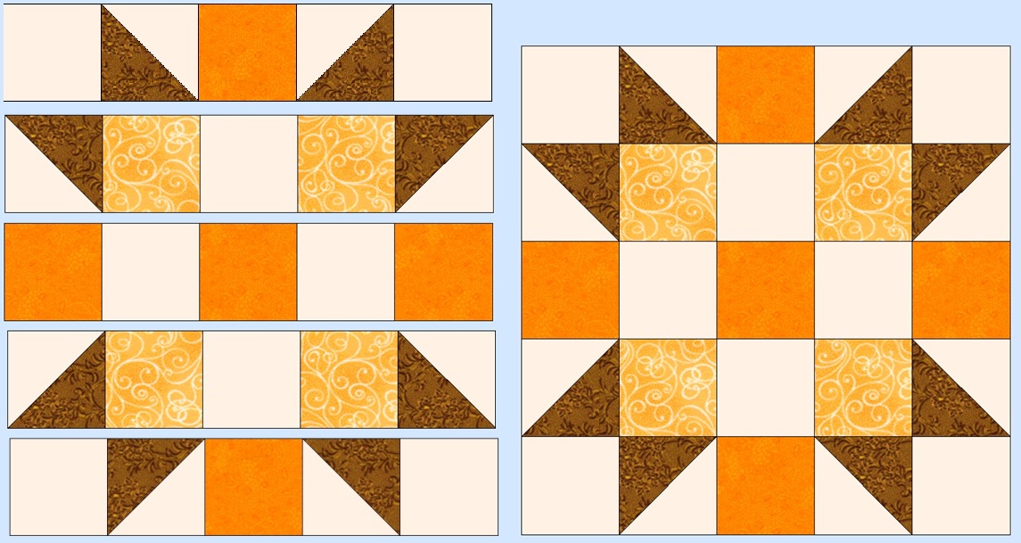 Why am I not recommending colors? Honestly, almost any color in any position works. The block in Electric Quilt was quite loud, all bright solid colors, not my taste at all. I pulled fabrics from my scrap basket and really liked how my block came out. (Both shown below) First things first, let's get the diagonal half squares done. Directions and diagrams on how to make DHSs can be found here if you need them. First, mark your background 3 1/4 inch squares diagonally through the center. (This will be a cutting line when you are finished.) Place a two different color 3 1/4 inch squares right sides together. Sew on either side of the drawn line, exactly 1/4 inch from the first line. Cut this square in half on the cutting line. You will now have two diagonal half-squares, which should measure exactly 2 7/8 inches. Press all to the darker side of the block. ![]() Middle row first, you only need one of these. This is row two and/or four, which will go on the middle row. You need two of these. Pay close attention to the direction your diagonal half square goes, it does make a difference. You may sew these to the middle row now if you would like, but again, pay attention to the direction of your diagonal half square. ![]() And the last two rows go like this, again pay attention to the direction your diagonal half squares go. ![]() And they go on the top and bottom of rows 2, 3 and 4. Your finished block should measure 12 1/2 inches. ![]()