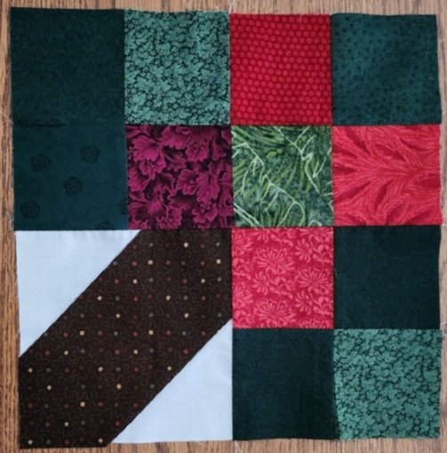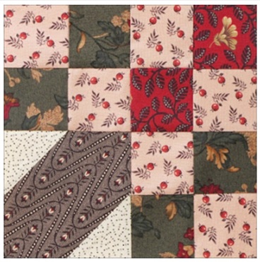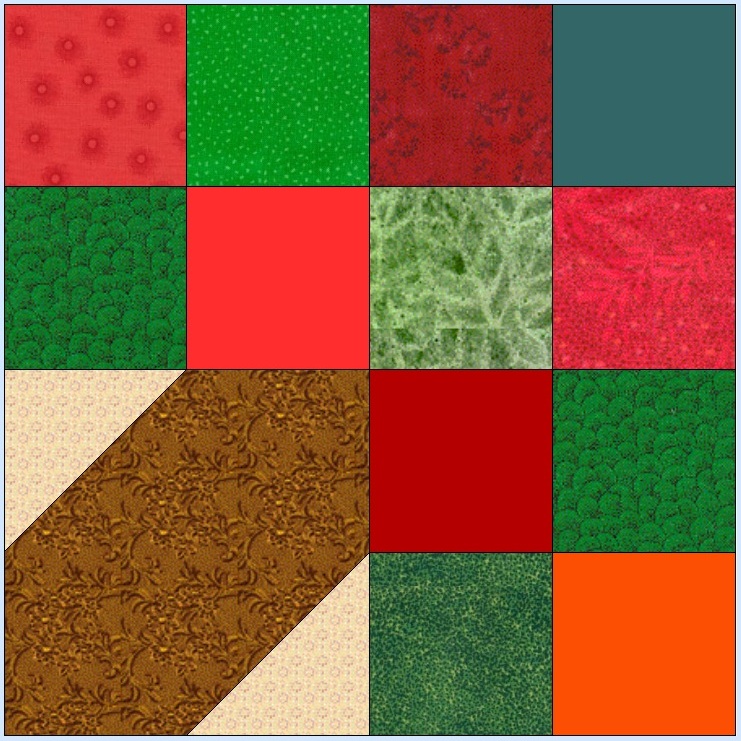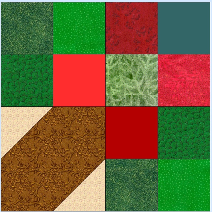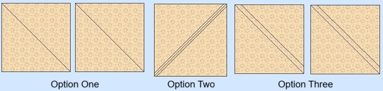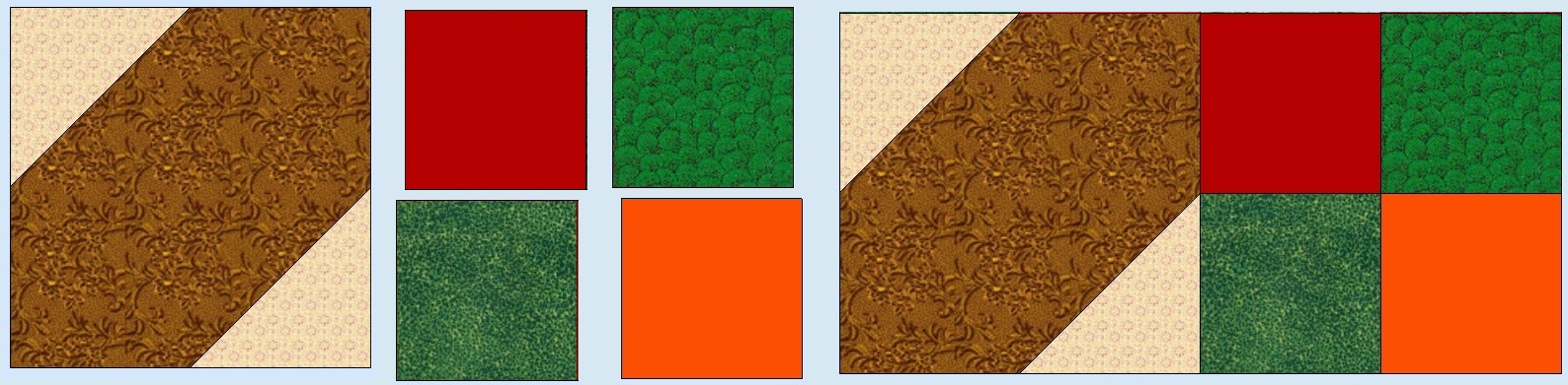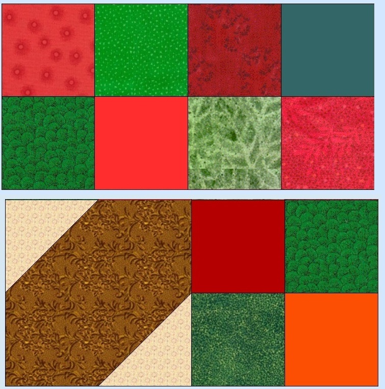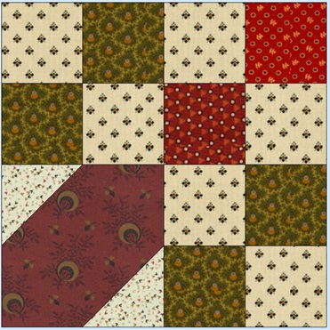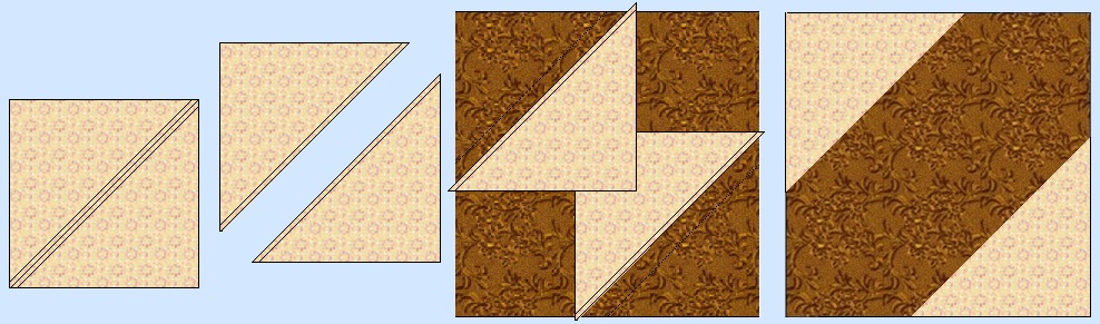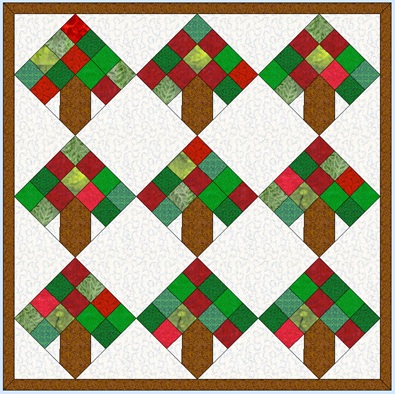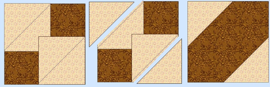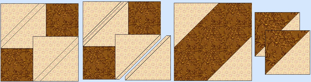 For the trunk of the tree, you need one 6 1/2 inch brown square and two 3 7/8 inch background color squares. OR you could use just one 4 inch square, your choice. Read next few paragraphs so you can see your options. ![]() Option 1 - To make the trunk you need to mark the two squares diagonally through the middle, place that right sides together with the brown square and sew on that line, then trim off the excess. ![]() Option 2 - However, if you use a 4 inch square, and draw a line diagonally down the middle, then mark two lines, 1/4 inch either side of that center line, and cut on the center line, and then sew those triangles carefully on the brown square on what was the center line. ![]() And there is another option also… Option 3 - back to the 3 7/8 inch squares. When you are marking them, mark a second line 1/2 inch from the center line on one side only. After you sew on the center line, sew on the line you made 1/2 inch from that. And then cut 1/4 inch between those two lines. You will now have now only your tree trunk, but two 3 inch diagonal half squares you can add to your scrap basket. ![]() Which ever option you decided to do, you can now put together your Apple Tree block. Since the trunk is finished, and all your square are cut, I suggest you lay them all out and move them around until you are pleased with the apple and leaves arrangement. However many of each you have, move them around until you are happy with the way they look.