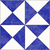 This two color block has many names: Big Dipper, Bow Ties, Envelope Quilt, Hour Glass, Pork and Beans, The Whirling Blade and Yankee Puzzle. A three color version is called Electric Fan and that block can be found here.