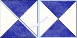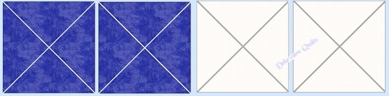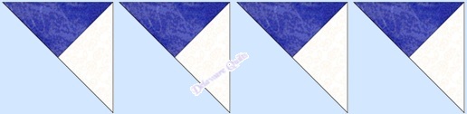 To make this block you need two blue 7 3/16 inch squares, which you will cut into quarters diagonally and two white cut two 7 3/16 inch squares, which you will cut into quarters diagonally. Yes 3/16ths is an odd measurement, and some rulers don't even have 16ths on them. Cut what some people call a scant 1/4, or between 1/8 and 1/4 on your ruler.