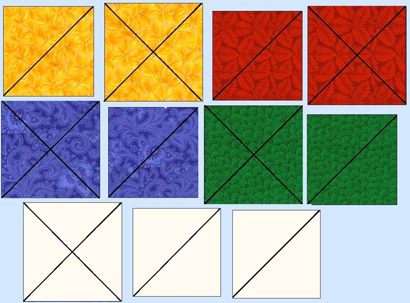 From color one cut one 4 7/8 inch block, then cut in half diagonally