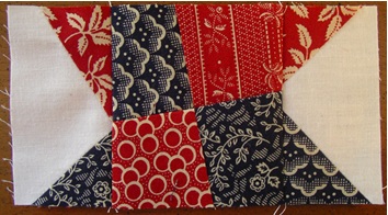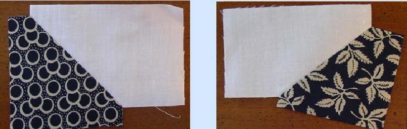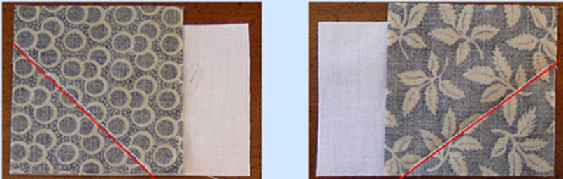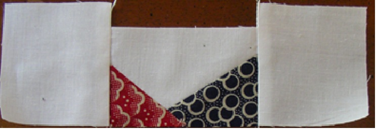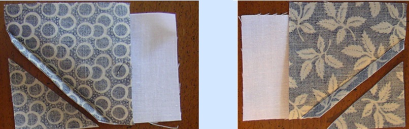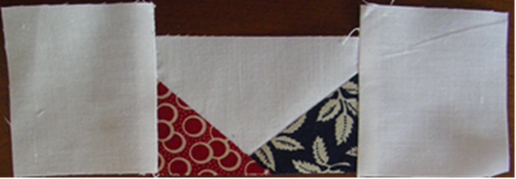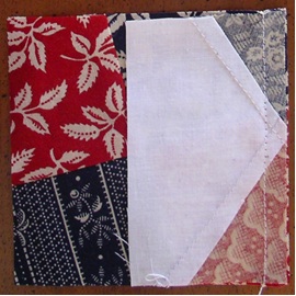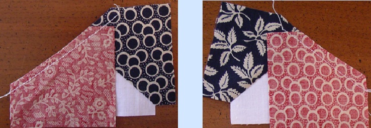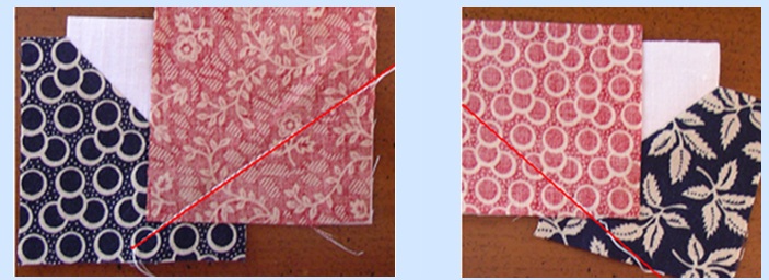 Now we can move on to the flying geese units, but believe me these will be the easiest flying geese you have ever made. Simply lay one of your 2 1/2 inch squares on the corner of a rectangle unit, and sew a line diagonally across any way you please. If you go all the way to the top of the square, or you won't have any points at all. Remember that square is bigger than your rectangle. (If you don't want to lose any of your points, that is ok! I have to remember to lose points on purpose.) The red line is just showing you my sewing line.       ![]() Don't forget to trim back your excess fabrics, leaving at least a 1/4 inch seam allowance. I just use my scissors to do this, but if you really have to, you may use your rotary cutter and ruler. I forgot to trim when I did these, as you can tell by the pressing lines. However, I did remember, which is important! Press carefully towards the squares. And now add the second square to your rectangle. Remember to angle your sewing lines a little different each time, to give your point a variety of height and width.       ![]() Trim off the excess, leaving at least a 1/4 inch seam allowance. Press again to the square, and then trim these back to the 2 by 3 1/2 inch rectangles you started with.       ![]()