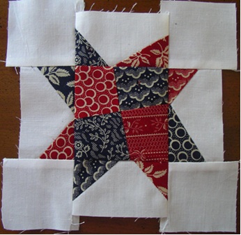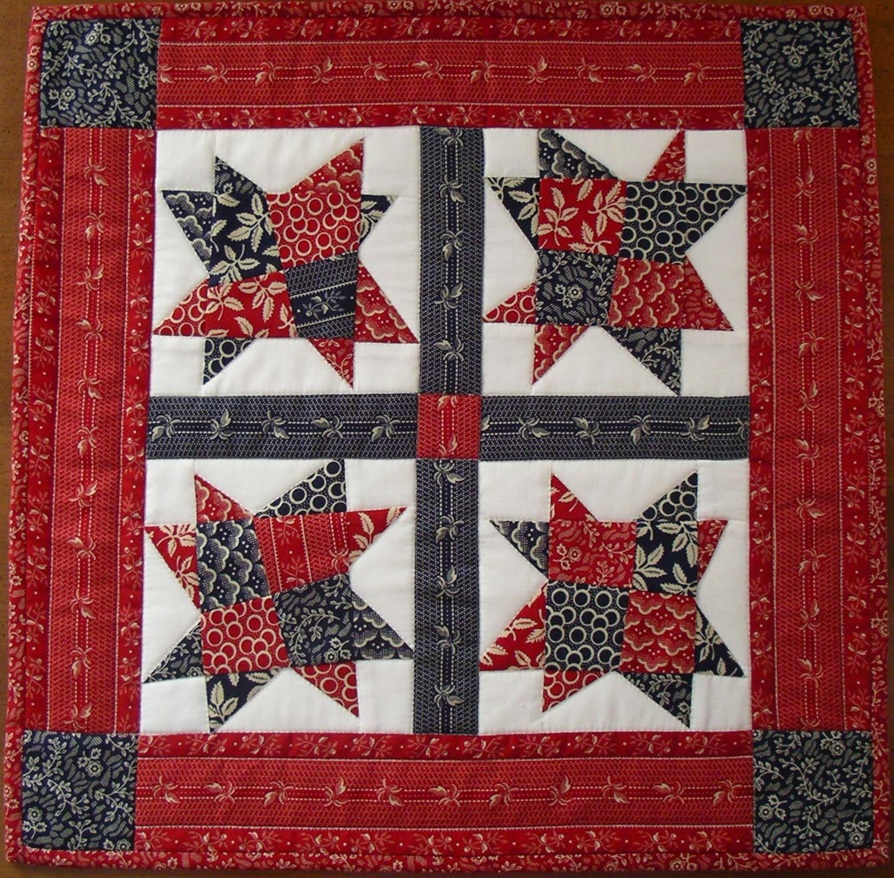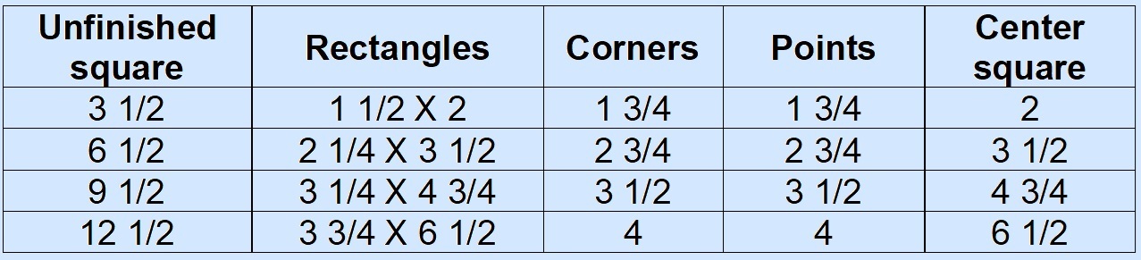 You can make your crooked stars any size you want to make them. Basically this is a nine patch star, four corners, your center square and four crooked flying geese. You can make it any size you want to fit the project you are making. The graph below shows you how to make four traditional size crooked stars. ![]() (My directions will be for a 5 1/2 inch finished block, 6 unfinished, so remember that as you are sewing along. Odd size I know, but I was sewing a sample and not really paying attention to size. That measurement fit my ruler best, so I used it. And besides, it made a cute wall hanging! ) If you want to make a 12 1/2 inch block, below are the cutting requirements.      For each block you will need to cut four 3 3/4 by 6 1/2 inch rectangles and four 4 inch squares of background pieces, white, white-on-white or very lights colors.      For each point you need one 4 inch square, so you need a total of eight, either all the same or all different.      And you need a 6 1/2 inch square for your center. (Or you can make that a four patch, or even a nine patch, just which ever strikes your fancy as long as it equals 6 1/2 inches when you finish making it.)