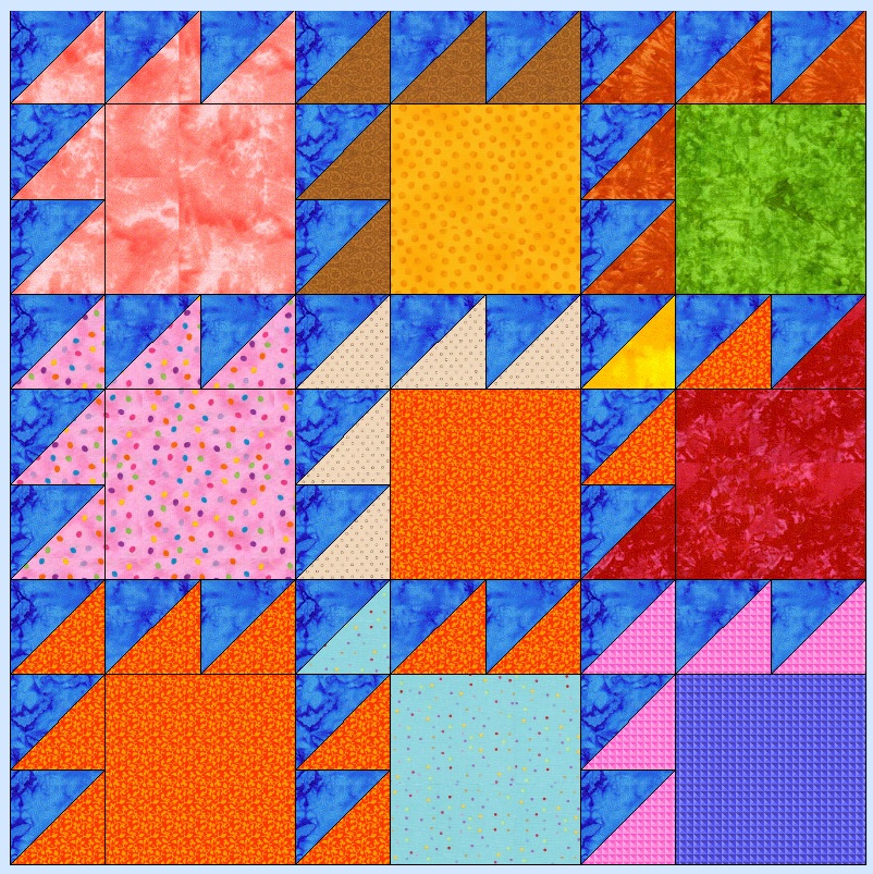 If I was putting the quilt above together, I would put together the longest rows, in this case the center rows. Then I would work my way outward, until I was finished. Easy on this quilt. Of course it would need borders, quilting and binding too. (Use your imagination on the quilting please.)