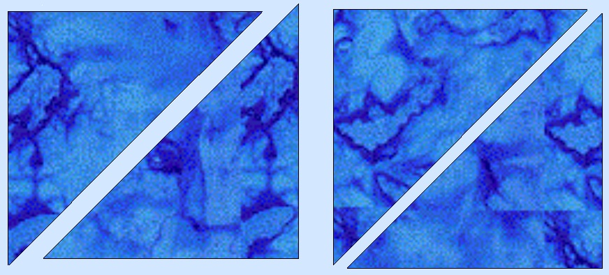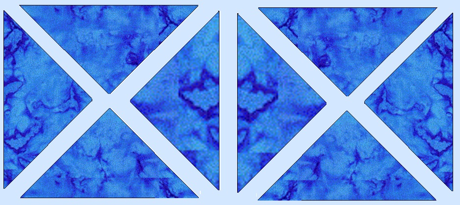 Our fish blocks should be 12 1/2 inches, so you multiply that by 1.414 which would give you 17.65 to which you add 1 1/4 (or 1.25) That equals 18.925, which is close enough to 19 that I would cut my side triangles 19 inches. Now, to assure that the stretchy side of that square is not on the outside of the quilt, you need to cut that 19 inch block in quarters diagonally.