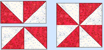 Sew them together into pairs which look like this, and then sew the two together to finish one pinwheel unit. This unit should measure 4 1/2 inches.