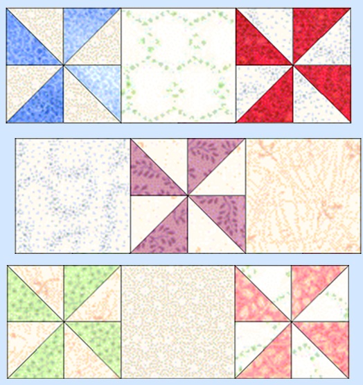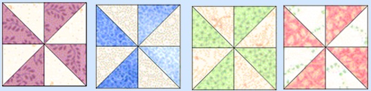 The basic pinwheel block is simply four diagonal half squares (a.k.a. triangle squares or half square triangles) put together in a four patch block. The Flutter Wheel is five basic pinwheels and four plain squares.