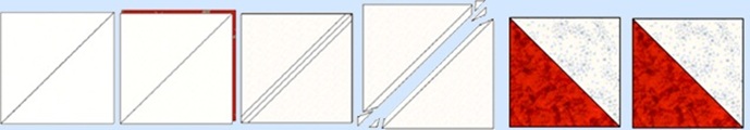 Here are step by step directions to make two diagonal half squares. Carefully draw a line corner to corner, (diagonally) through the white or lightest 2 7/8 inch squares. This will be a cutting line when you are finished. Place red and white 2 7/8 inch square right sides together. If you have a true 1/4 inch foot on your machine, you can sew on either side of the drawn line. If not, you will have to draw a second line on either side, exactly 1/4 inch from the first line. Those will be your sewing lines. After you have sewn on the sewing lines (1/4 inch on either side of your corner to corner to line) you will cut this square in half on the drawn cutting line. Clip off the corners as shown. You will now have two diagonal half squares, which should measure exactly 2 1/2 inches.