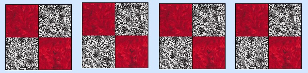 Sew a dark strip between each four patch, making sure your primary color, in this case red, is in the center bottom.