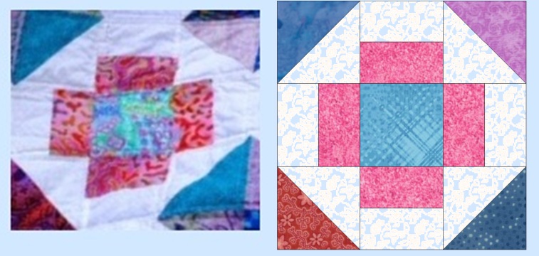 Place the background and dark strips right sides together, and sew using a 1/4 inch seam allowance. Cut into four 4 1/2 inch segments. ![]() To make the corner units, place a background and medium 4 7/8 inch square right sides together. Mark a line diagonally from corner to corner, and then mark a second line 1/4 inch on either side of that line. The first line is your cutting line, and the second two will be where you sew. Sew on the two sewing lines, cut on the cutting line, and open up your squares. Press to the darker side. You now have two 4 1/2 diagonal half squares. ![]() Now sew the rows pieces as shown in this diagram to finish your Greek Cross block. ![]() My friend Brenda gave me permission to share this picture of her scrappy Greek Cross. To be honest, it took me a bit to work out where the block was but once I did I was amazed. I've pulled one block from her quilt and diagramed it here. However, you have to remember that every block is different. Every diagonal half square is split up between blocks, one half used in one block and the other half in a different block. Even some of the rectangles are switched around. The only consistant thing in this quilt is the background, and that's what makes it so beautiful. Well done Brenda and thank you allowing me to share it. ![]() ![]() without the owner's permission. This includes the patterns as well as any graphics and/or instructions that are associated with a pattern. The content on these pages, including text and images are the sole property of the Delaware Quilts and may not be used in any manner without consent. All Rights Reserved. Updated October 4, 2025 |Home| Quilts| Email| |