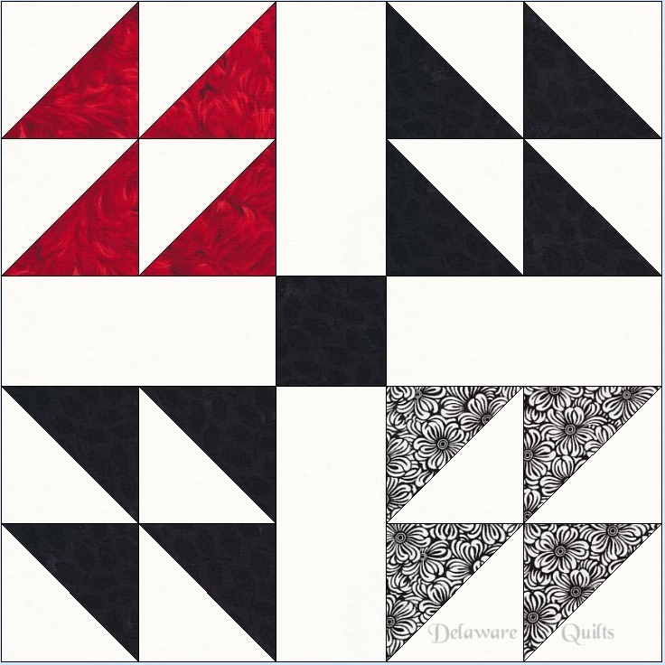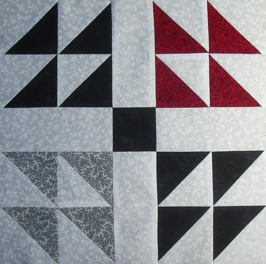 Next sew a white strip between a red and black unit. Again, pay attention to the direction your DHSs are pointing.