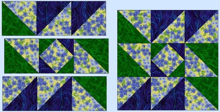 Place a 4 7/8 green block and a 4 7/8 background block right sides together. Carefully draw a line down the center, corner to corner, diagonally across the block. (This will be a cutting line when you are finished.) If you have a true 1/4 inch foot on your machine, you can sew on either side of this drawn line. If not, you will have to draw a second line on either side, exactly 1/4 inch from the first line. This will be your sewing line. After you have sewn on your sewing line, 1/4 inch on either side of your corner to corner to line, you will cut this square in half on your cutting line. You will now have two diagonal half-squares, which should measure exactly 4 1/2 inches. Repeat with the remaining 4 7/8 inch squares. ![]() Now on to the center square of this block. It's really pretty easy. Take your 4 1/2 inch background square, and place a green 2 1/2 inch square right side together on the upper left corner. Sew diagonally from corner to corner as shown. (It might be helpful to mark your diagonal line.) Trim the excess leaving a 1/4 inch seam allowance. Press to the green. Now place another green on the opposite corner. Then repeat with blue squares to make blue corners . The center square should measure 4 1/2 inches. ![]() Assemble your Indiana Puzzle block as shown. You completed block should measure 12 1/2 inches. ![]() without the owner's permission. This includes the patterns as well as any graphics and/or instructions that are associated with a pattern. The content on these pages, including text and images are the sole property of the Delaware Quilts and may not be used in any manner without consent. All Rights Reserved. Updated October 10, 2025 |Home| Quilts| Email| |
