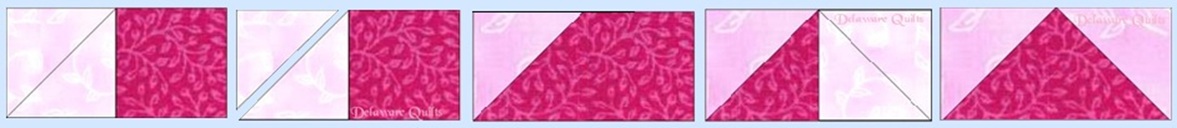 Lay a background square right sides together with a hot pink rectangle, with the diagonal line running as shown here. Sew right on that diagonal line. Trim off the excess, leaving a 1/4 inch seam allowance. Press to the pink. Repeat this same step again with another background square on the other side of this same unit. Press to the pink. Make sure your rectangles still measure 3 1/2 by 6 1/2. This is called a flying geese unit.