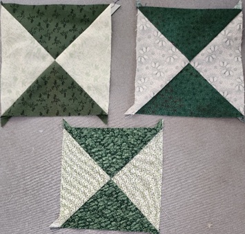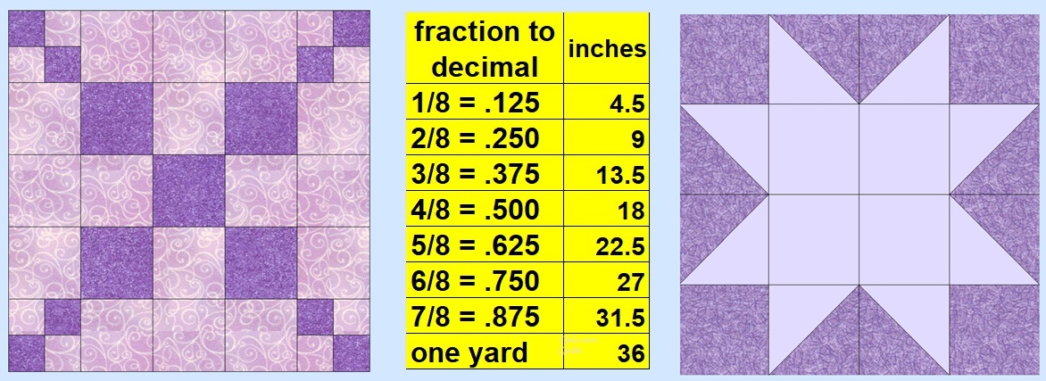 My first quilting project had diamonds in it, diamonds. Anyone can tell you that is not a good project for a starting quilter, and I soon realized that myself. (I didn't know about templates or anything else.) I learned the hard way, but I learned. If you look at the quilts page, you will see that Lone Star project and many other of my beginning projects, lots of squares.       So let's talk about squares, an easy thing to figure the math of. A simple nine patch block, all squares. The diagram below shows three nine patch blocks, a six, a nine and a twelve inch. Three identical blocks, all made the same but different. ![]()       For all three blocks you need five light squares and four dark squares. For the 12 inch block you might say there are 3 in each row, so 12 divided by 3 equals 4 and cut 4 inch squares. If you do, you wouldn't get a 12 inch block. What you really need is a 12 1/2 inch block, because you need a seam allowance.       Lets start over with that 12 1/2 inch block. Yes, you need 3 squares. But you need them for a 12 1/2 inch block, and those little squares need seam allowances also. 12 inches divided by 3 equals 4 inches. 4 inches plus 1/2 inch (1/4 for each side) equals 4 1/2 inches. So to make a 12 1/2 inch unfinished nine patch quilt block you need to cut 4 1/2 inch squares. When it is finished meaning in the block, it will measure 4 inches.       How about the 6 inch finished nine patch block? 6 plus seam allowances equals 6 1/2 inches. 6 divided by 3 equals 2 plus 1/2 inch for seam allowance equals 2 1/2 inches. For the 6 inch finished nine patch quilt block you need to cut 2 1/2 inch squares.       What about a block that has more than nine segments, like this Single Chain and Knot, the block below? That block has five rows across and up and down. A 12 inch finished single chain has 5 segments or units.     12÷5=2.4     2.4+.5=2.9     Confused? OK, first we've converted to decimals, that makes it easier than dealing with fractions in the math of quilting some of the time, like this case. The diagram shows what each fraction measurement equals in decimals. So 1/2 becomes .5, 3/4 is now .75. But that .9, well that isn't even on the chart is it? In this case, and in many others were just squares go, you could cut 3 inch segments which is what is the correct measurement. How do I know? Math. ![]()       What about that sawtooth star, it has triangles? Ok, moving on to triangle half squares or diagonal half squares. For diagonal half squares, the math gets a little more complicated. Remember "finished" size, this block is 9 inches. If you are making diagonal half squares to put in a "finished" nine-patch square, you will need those diagonal half squares to measure 3 1/2 when you are done. But because your diagonal half squares will have a seam in them, going diagonally from corner to corner, you have to add a seam allowance in them as well. You add 3/8 for this seam allowance. Your squares to make diagonal half squares from should be cut 3 7/8 inches. (3 1/2 + 3/8 = 3 7/8)