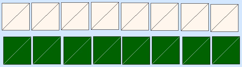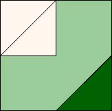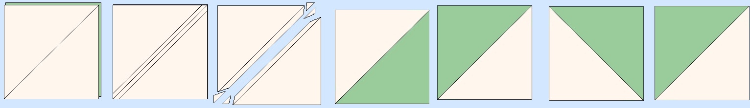 First we'll make the diagonal half squares using the background and medium color 4 7/8 inch squares. (You can find directions for diagonal half squares are here) Press to the medium side. This should measure 4 1/2 inches when finished. You need four, so repeat with the other two 4 7/8 inch background and medium squares.