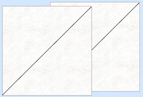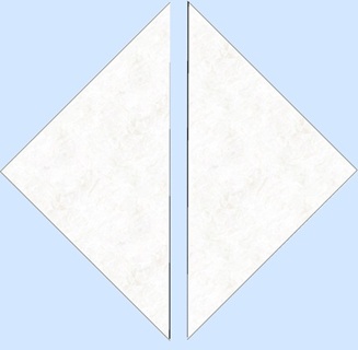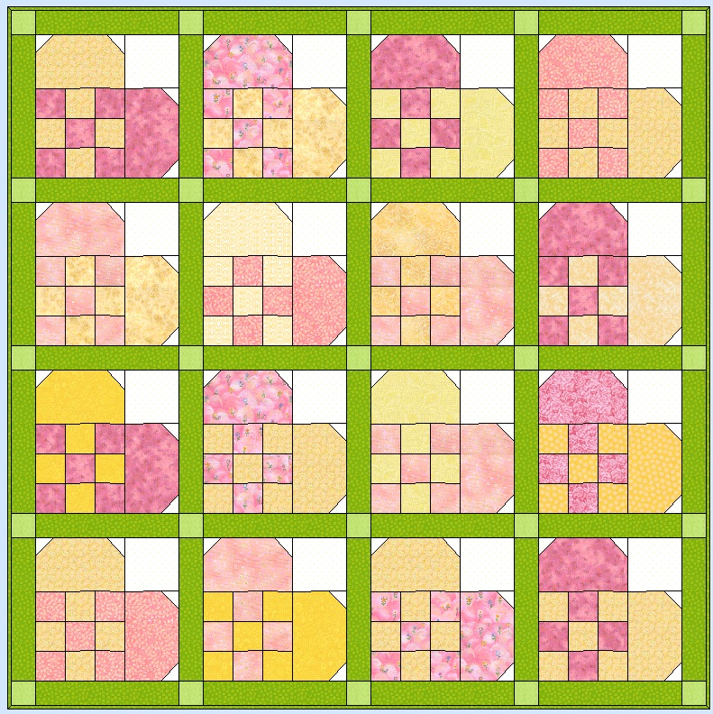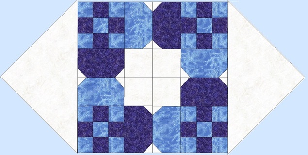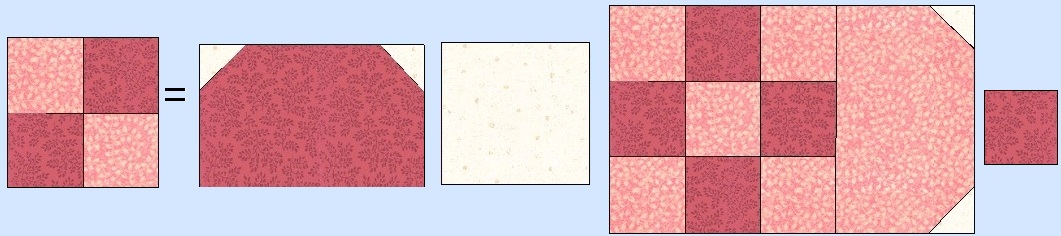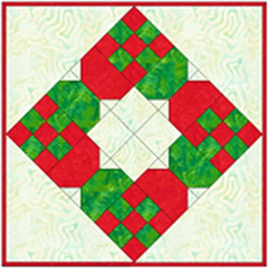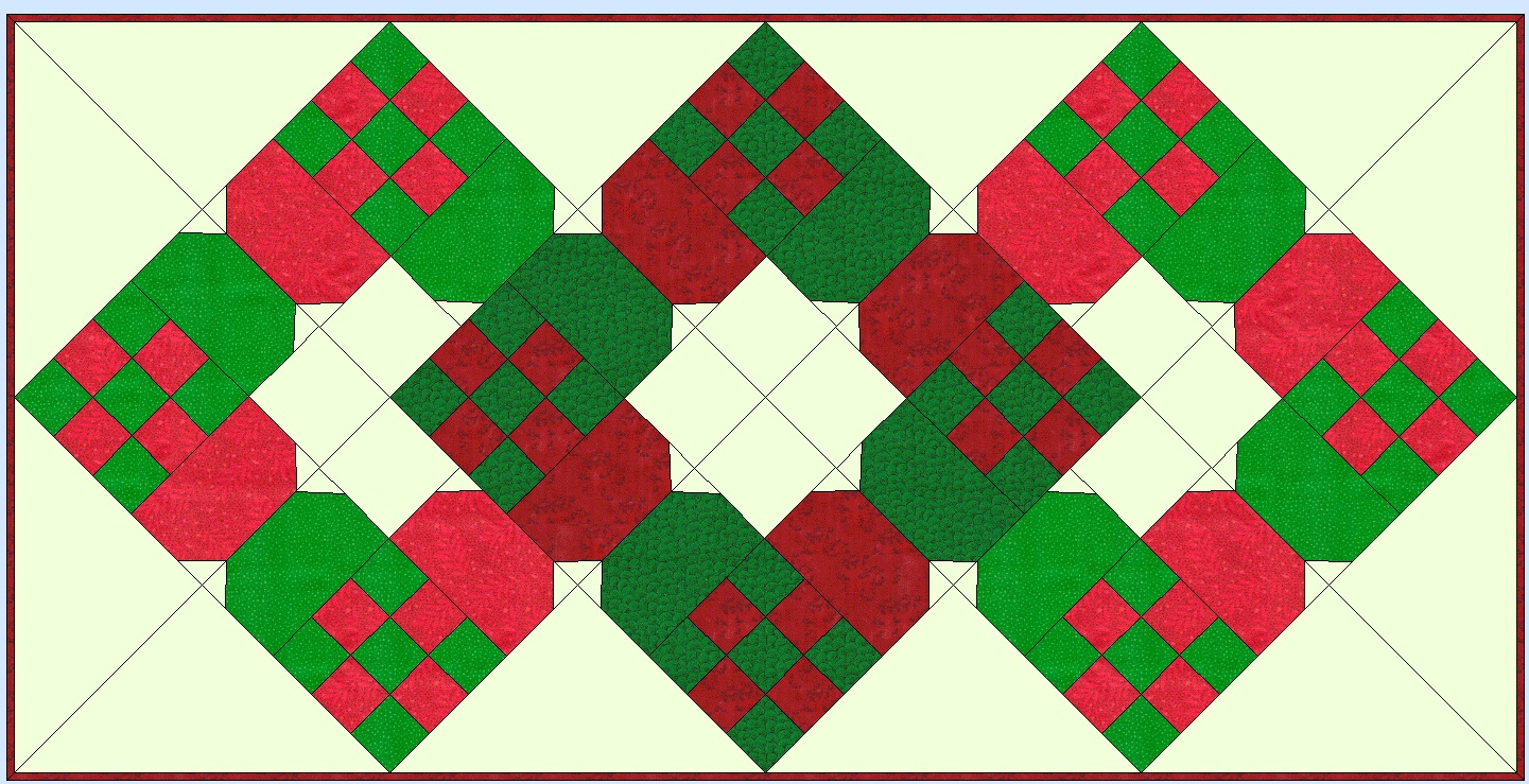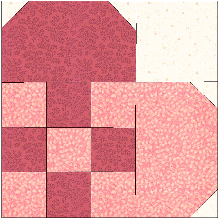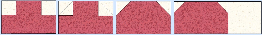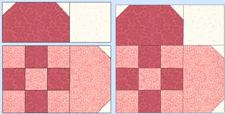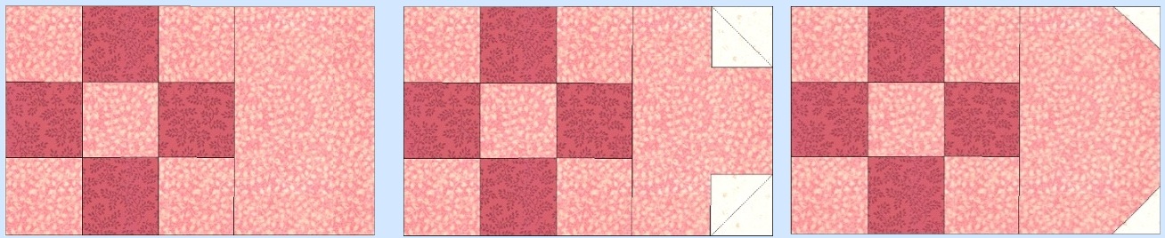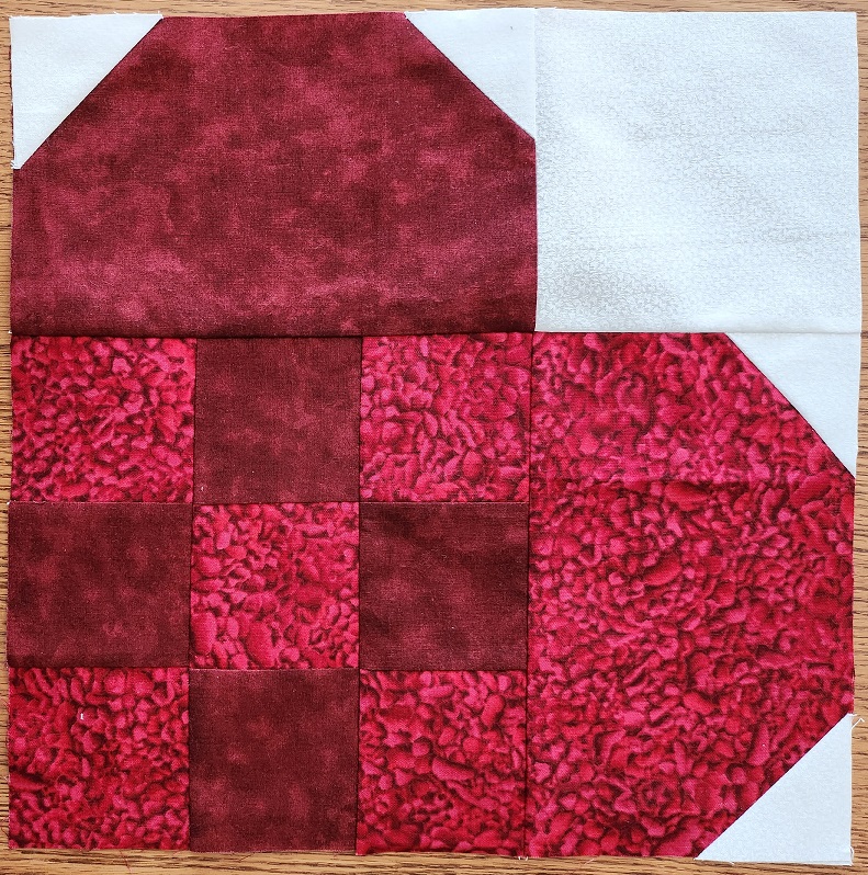 Add the 7 x 5 rectangle to one side of the nine patch as shown. Then add two 2 1/4 inch squares to each corner and sew diagonally from corner to corner. Now if you want, you may trim off the excess leaving a 1/4 inch seam allowance. (I left mine on since I had dark red fabrics and the double layer of white-on-white helped mask the dark reds underneath the corners.) ![]() Next add the corners to the 8 x 5 rectangle, and then sew it together with the 5 inch background square. ![]() That goes on the top of the block and your block is finished. It should measure exactly 12 1/2 inches. ![]() My sample block is on the left. And on the right is a little heart table topper I saw in a Christmas ad in a magazine, not a quilting magazine either. It looked something like this one, and had a candle and other Christmas goodies sitting on it, which really appealed to me. To make this little topper you would need four hearts and some extra background fabric, plus the backing and binding.        ![]() To make a little table topper like that wouldn't be that hard really. First you need four nine patch hearts. You can make them all the same or all differnt. BUT you should use all the same background fabric. When deciding what fabric to use for your background, remember you will also be using it for your topper corners. You will need two 25 inch squares for those corners. When your nine patch hearts are finished, sew all four together as shown. Next cut those 25 inch squares in half diagonally. If you don't know why, it's so you can sew the bias to the edge of the nine patch hearts square, which is the stretchiest part of the fabric. That will make yout table topper lay flat nicely, and not have wavey edges and stretch out of shape. Because this is a large square you are cutting, I would certainly mark that diagonal line before I attempted to cut it. Folding it to cut it, then finding out you folded it wrong is horrible, ask me how I know. If you've marked it, then you can fold it properly if you must.                 ![]()