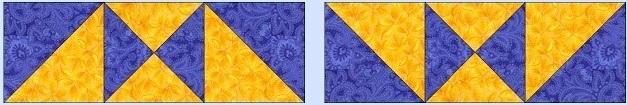 First make your corner blocks. Take the 4 7/8 inch squares of blue and yellow, place them right sides together. Carefully draw a line down the center, corner to corner, diagonally across the block. (This will be a cutting line when you are finished.) Now if you have a true 1/4 inch foot on your machine, you can sew on either side of this drawn line. If not, you will have to draw a second line on either side, exactly 1/4 inch from the first line. These will be your sewing lines. After you have sewn on your sewing lines, you will cut this square in half on your cutting line. You will now have two triangle squares measuring exactly 4 1/2 inches. Repeat, and the four corner blocks are complete. ![]() To make the quarter square units, place a blue and yellow 5 3/8 inch squares right sides together. Follow the same directions above for making the triangle squares. After you have sewn on your sewing line, 1/4 inch on either side of your corner to corner to line, you will cut this square in half on your cutting line. Now this is where it is a little different. You then will cut it a second time on the opposite diagonal. Put them together as shown here. You need four which should all measure exactly 4 1/2 inches.