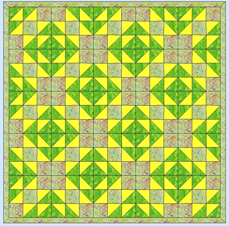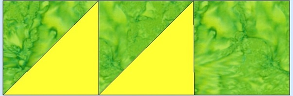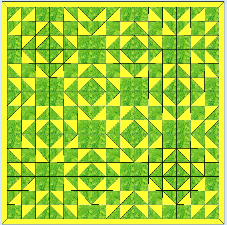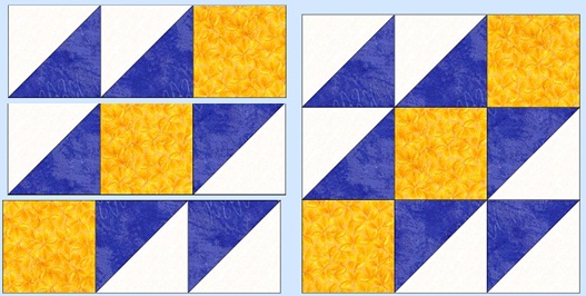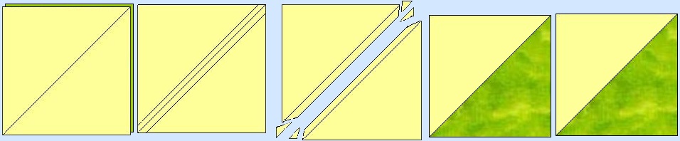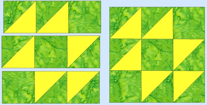 Sometimes a block has many names and this is one of them. It was called Old Maid's Puzzle in the American Farmer's Magazine in ladies section called “The Farm House” when it was published in 1895. Other names include Jacks on Six, Double X, Three and Six, Cat's Cradle, Kindergarten Block. For a two color 12 inch finished block you will need:       From a background (green) cut three 4 7/8 inch squares and three 4 1/2 inch squares       From a second color, contrasting to the first one, (yellow) cut three 4 7/8 inch squares We will be making triangle squares for this block. (Triangle squares, diagonal half squares, or half square triangles. They are all the same thing, just different names.) You may use which ever method you like to make these, this is my favorite. We will make two blue and white triangle squares first. Carefully draw a line corner to corner, (diagonally) through the white 4 7/8 inch squares. This will be a cutting line when you are finished. Place red and white 4 7/8 inch square right sides together. If you have a true 1/4 inch foot on your machine, you can sew on either side of the drawn line. If not, you will have to draw a second line on either side, exactly 1/4 inch from the first line. They will be your sewing lines. After you have sewn on your sewing line, 1/4 inch on either side of your corner to corner to line, you will cut this square in half on the drawn cutting line. Clip off the corners as shown. You will now have two triangle squares, which should measure exactly 4 1/2 inches. ![]() Repeat with the remaining 4 7/8 inch squares, you need a total of six 4 1/2 inch triangle squares. Your block should measure 12 1/2 inches which will be 12 inches when sewn in a quilt. ![]()