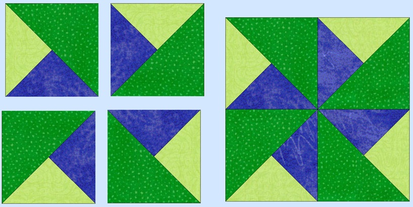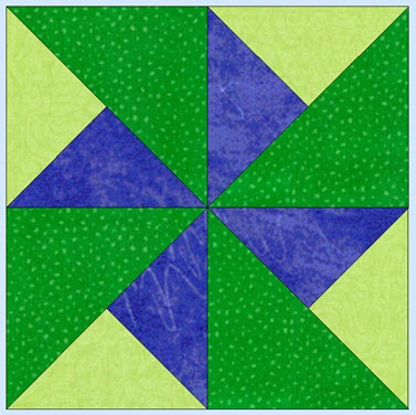 When you cut these squares, you created bias edges. Be very careful when sewing and pressing not to stretch that bias.       Place a blue and pale green triangle right sides together and together sew on the short side. Repeat with the remaining blue and pale green triangles. Be sure to sew them all on the same side so all four are alike. ![]() Sew the two color units to dark green triangles. Press to the dark green. Trim back to 3 1/2 inches if needed. Repeat with the remaining units. ![]() Then sew them together into halves, and then the whole block. Your block should be 6 1/2 inches square. ![]() Here are the cuts needed to make Pinwheel blocks in many different sizes: (Remember, a 16th is a scant measurement, or between an eighth and a quarter on your ruler) For a three inch finished Pinwheel block       From dark green cut two 2 3/8 inch squares, which you will cut in half diagonally       From pale green cut one 2 11/16 inch square, which you will cut into quarters diagonally       From blue cut one 2 11/16 inch square, which you will cut into quarters diagonally For a nine inch finished Pinwheel block       From dark green cut two 5 3/8 inch squares, which you will cut in half diagonally       From pale green cut one 5 11/16 inch square, which you will cut into quarters diagonally       From blue cut one 5 11/16 inch square, which you will cut into quarters diagonally For a 12 inch finished Pinwheel block you will need:       From your dark green cut two 6 7/8 inch squares, which you will cut in half diagonally       From your pale green cut one 7 1/4 inch square, which you will cut into quarters diagonally       From your blue cut one 7 1/4 inch square, which you will cut into quarters diagonally For a fifteen inch finished Pinwheel block       From dark green cut two 8 3/8 inch squares, which you will cut in half diagonally       From pale green cut one 8 11/16 inch square, which you will cut into quarters diagonally       From blue cut one 8 11/16 inch square, which you will cut into quarters diagonally