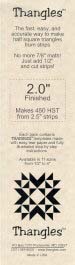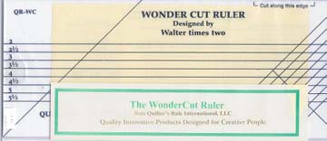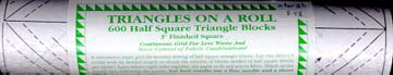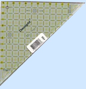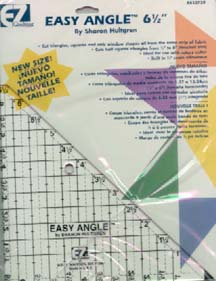Just be sure you read carefully the paper pattern, and know what "finished" size you will end up with. Remember a finished square is when it is completely finished, sewn into the quilt, not the size the square will be when you are finished sewing the two triangles together. Some paper patterns give you both sizes, the finished size and the unfinished size. Know what size you need! For the paper method, press your two fabrics, right side together. Pin the paper on top, and sew away. Follow the arrows if given. If you need fewer squares than on a sheet, cut them up! I have personally used Triangle Paper, Triangles on a Roll, and Thangles . (And that is the order I like them in.) Method F: There are also a variety of rulers on the market to help you make perfect diagonal half squares. There are so many, that I am not going to explain each one. I have heard good and bad things about all of them, and truly believe that it is up to the individual as to what will work for them. ![]() ![]() ![]() ![]()