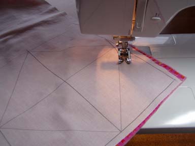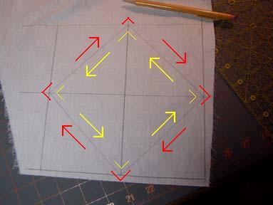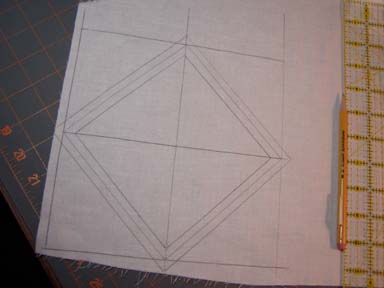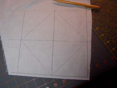 There are several different ways to make diagonal half squares when you need a lot of the same ones from the same two fabrics. Hopefully one of these methods will be the right one for you. Method D: First you need to draw a grid of squares on your fabric. (I'm using 3 7/8 inch squares, which fits the camera better.) ![]() ![]()