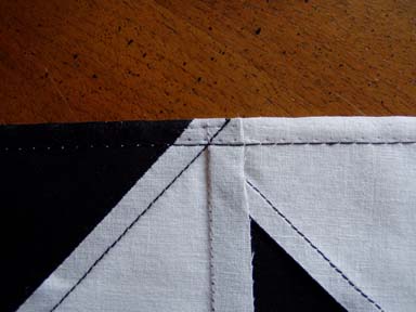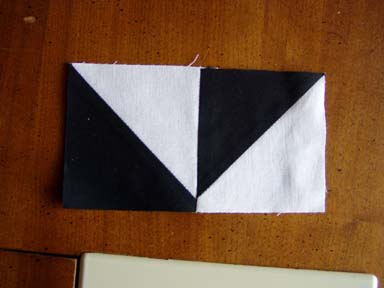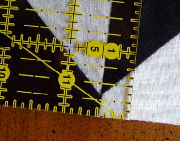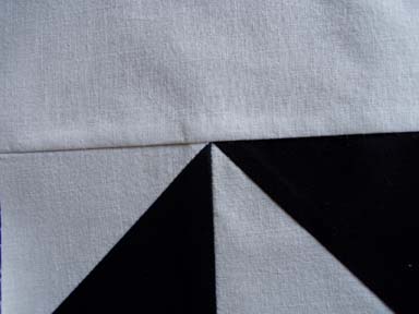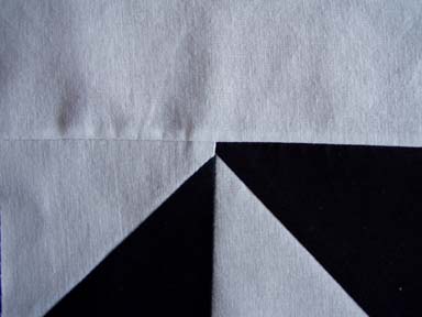 On all methods be sure to trim off the corners, or the "dog ears" so that your squares are truly squares, and don't have any extras sticking out. Before pressing the squares open, trim the tips at an angle, beginning at the edge where the stitching stops. You can trim with scissors or a rotary cutter, just be careful not to cut your stitching. There are great illustrations about "dog ears" at Bethany Reynolds' web site. Now that you know how to make diagonal half squares, let's talk about sewing them into blocks, and those blocks into quilts. One thing that is VERY important is NOT cutting off your points when you sew your diagonal half squares into blocks. When you make your diagonal half squares, the points should be exactly in the corner. If they are not, you either didn't sew straight, or cut straight, or trim them back evenly. ![]() If they are perfect, when you sew them together with another diagonal half square, it will seem like your points jump back, or move away from the edge of the block. This is correct, and that should happen. This way when you sew it with another block, those points are in the correct place, and will show. ![]() The distance that your points set back from the edge of the block should be exactly 1/4 inch, your seam allowance.