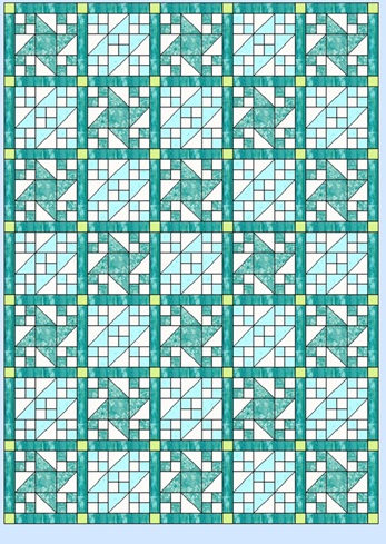 If we use 12 inch blocks, 12 times 5 blocks would measure 60 inches which is just enough to cover the top of the bed going across. I think I would like it with one more block 6 across. And going from the edge of the pillows to the bottom, 12 times six blocks again is 72 inches. If your bed has a footboard like mine, that would be ok as that last row of blocks would end behind that footboard. But if you don't have a footboard, you might want to go one more row, making your quilt six rows across and seven rows down for a center measurement of 72 by 84. I would add borders to finish the quilt evenly.
