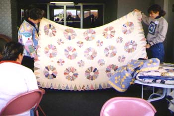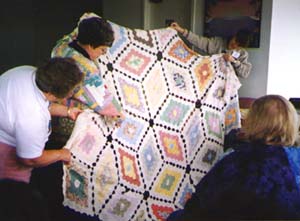 ![]() Anne brought this family 30's quilt to show.The Madgical Mystery Quilt was a big mystery, and lots of fun. Although the room was a bit crowded, everyone made do.