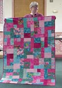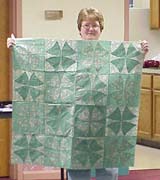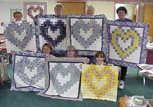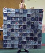 ![]() 5th year Candy showed her WIP and newbie Denny was proud to show her completed Spools and Hearts top. Debbie showed just two of her finished projects from the last year, her flannel quilt and her jeans quilt.