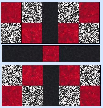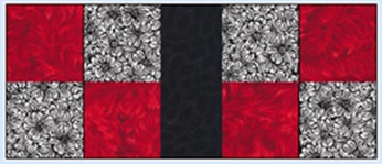 Sew a dark strip between each four patch, making sure your primary color, in this case red, is in the center bottom.