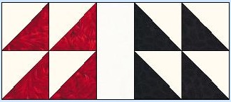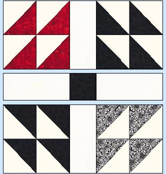 Next sew a white strip between a red and black unit. Again, pay attention to the direction your DHSs are pointing.