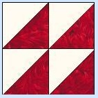 First, mark your white-on-white squares diagonally through the center. (This will be a cutting line when you are finished.) Place a red 3 3/8 inch square, right sides together with the 3 3/8 inch marked white-on-white square. Sew on either side of the drawn line, exactly 1/4 inch from the first line. Cut this square in half on the cutting line. Press to the darkest fabric, in this case red. You will now have two diagonal half-squares, which should measure exactly 3 inches. Repeat with the remaining 3 3/8 inch squares. Press these all the same, to the darkest fabric and away from the white-on-white.