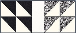 Now sew a white-on-white strip between a black unit and a print unit. Notice the direction the DHSs are pointing.