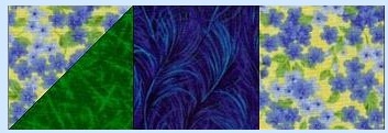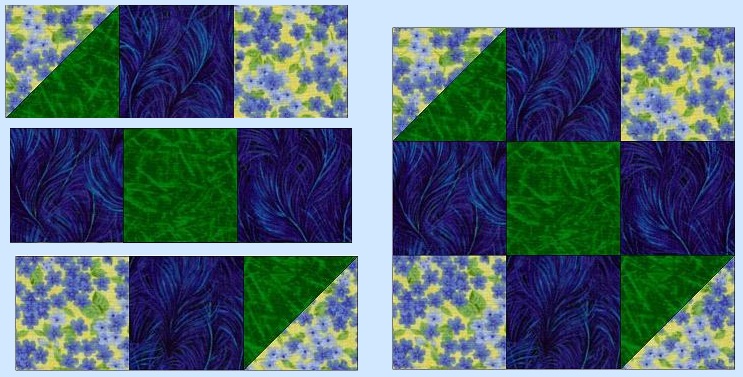 Place a 4 7/8 green block and a 4 7/8 background block right sides together. Carefully draw a line down the center, corner to corner, diagonally across the block. (This will be a cutting line when you are finished.) If you have a true 1/4 inch foot on your machine, you can sew on either side of this drawn line. If not, you will have to draw a second line on either side, exactly 1/4 inch from the first line. This will be your sewing line. After you have sewn on your sewing line, 1/4 inch on either side of your corner to corner to line, you will cut this square in half on your cutting line. You will now have two diagonal half-squares, which should measure exactly 4 1/2 inches. Repeat with the remaining 4 7/8 inch squares. ![]() Now you can assemble your block.