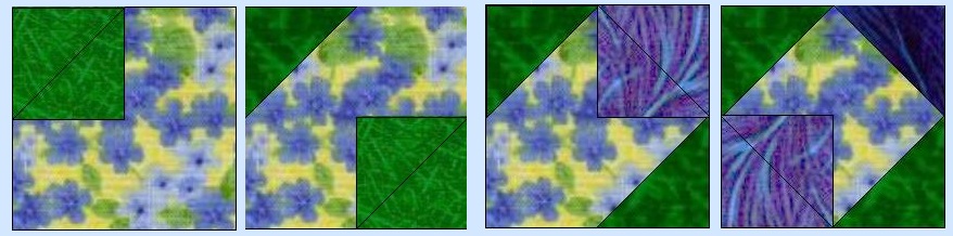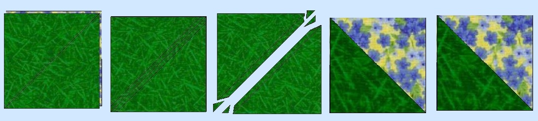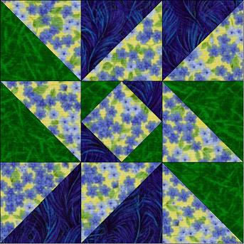 Place a 4 7/8 green block and a 4 7/8 background block right sides together. Carefully draw a line down the center, corner to corner, diagonally across the block. (This will be a cutting line when you are finished.) If you have a true 1/4 inch foot on your machine, you can sew on either side of this drawn line. If not, you will have to draw a second line on either side, exactly 1/4 inch from the first line. This will be your sewing line. After you have sewn on your sewing line, 1/4 inch on either side of your corner to corner to line, you will cut this square in half on your cutting line. You will now have two diagonal half-squares, which should measure exactly 4 1/2 inches. Repeat with the remaining 4 7/8 inch squares. ![]() Now on to the center square of this block. It's really pretty easy. Take your 4 1/2 inch background square, and place a green 2 1/2 inch square right side together on the upper left corner. Sew diagonally from corner to corner as shown. (It might be helpful to mark your diagonal line.) Trim the excess leaving a 1/4 inch seam allowance. Press to the green. Now place another green on the opposite corner. Then repeat with blue squares to make blue corners . The center square should measure 4 1/2 inches. ![]() Assemble your Indiana Puzzle block as shown. You completed block should measure 12 1/2 inches. ![]() without the owner's permission. This includes the patterns as well as any graphics and/or instructions that are associated with a pattern. The content on these pages, including text and images are the sole property of the Delaware Quilts and may not be used in any manner without consent. All Rights Reserved. Updated October 10, 2025 |Home| Quilts| Email| |