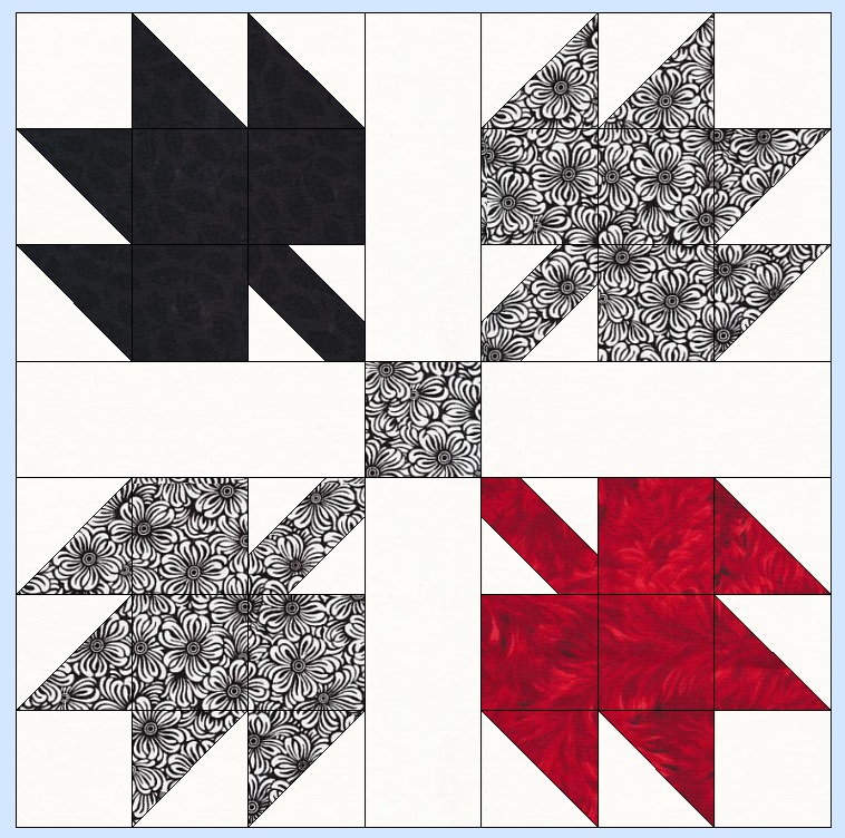 For each leaf you need to sew units which look like these which you will sew into four leaves which look like this one. Your leaves should be 5 3/4 inches square when they are finished.