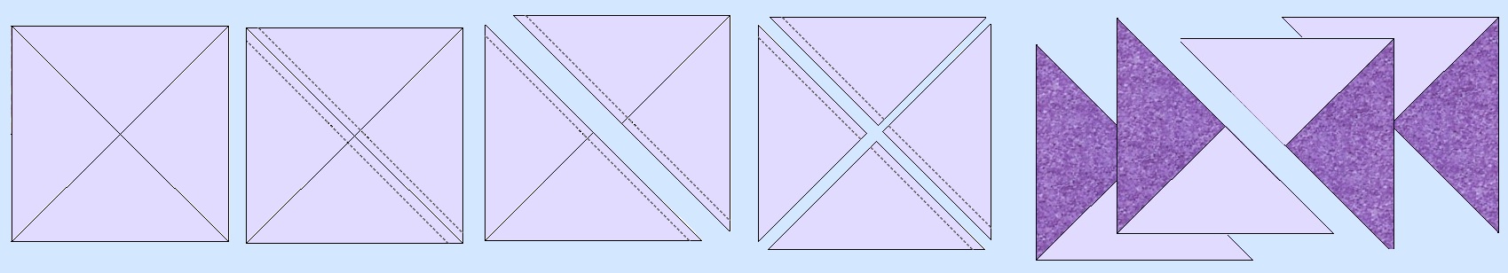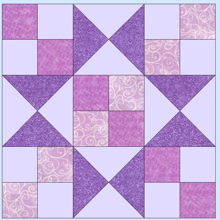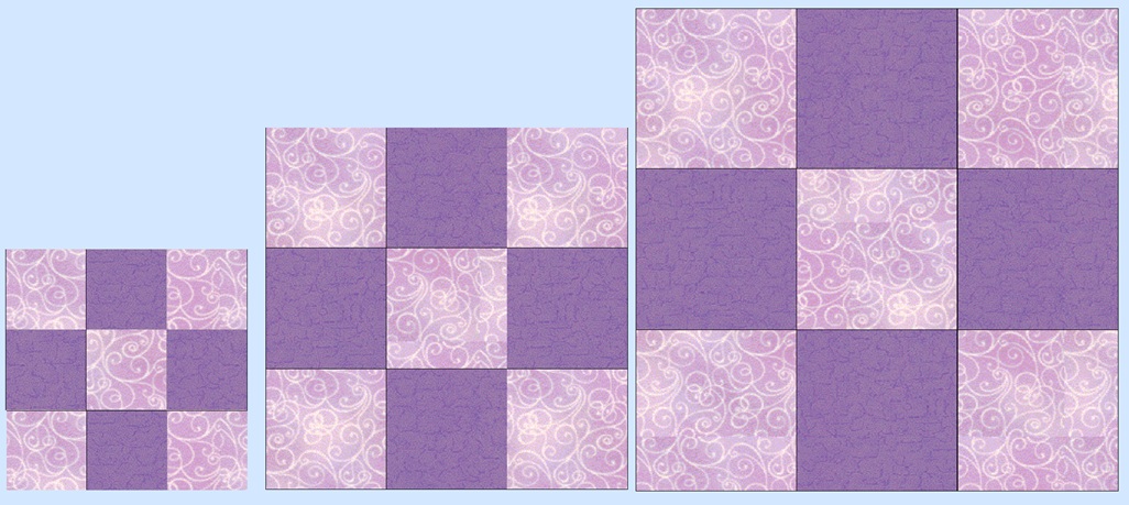 My first quilting project had diamonds in it, diamonds. Anyone can tell you that is not a good project for a starting quilter, and I soon realized that myself. (I didn't know about templates or anything else.) I learned the hard way, but I learned. If you look at the quilts page, you will see that Lone Star project and many other of my beginning projects, lots of squares.       So let's talk about squares, an easy thing to figure the math of. A simple nine patch block, all squares. The diagram below shows three nine patch blocks, a six, a nine and a twelve inch. Three identical blocks, all made the same but different. ![]()       For all three blocks you need five light squares and four dark squares. For the 12 inch block you might say there are 3 in each row, so 12 divided by 3 equals 4 and cut 4 inch squares. If you do, you wouldn't get a 12 inch block. What you really need is a 12 1/2 inch block, because you need a seam allowance.       Lets start over with that 12 1/2 inch block. Yes, you need 3 squares. But you need them for a 12 1/2 inch block, and those little squares need seam allowances also. 12 inches divided by 3 equals 4 inches. 4 inches plus 1/2 inch (1/4 for each side) equals 4 1/2 inches. So to make a 12 1/2 inch unfinished nine patch quilt block you need to cut 4 1/2 inch squares. When it is finished meaning in the block, it will measure 4 inches.       How about the 6 inch finished nine patch block? 6 plus seam allowances equals 6 1/2 inches. 6 divided by 3 equals 2 plus 1/2 inch for seam allowance equals 2 1/2 inches. For the 6 inch finished nine patch quilt block you need to cut 2 1/2 inch squares.       What about a block that has more than nine segments, like this Single Chain and Knot, the block below? That block has five rows across and up and down. A 12 inch finished single chain has 5 segments or units.     12÷5=2.4     2.4+.5=2.9     Confused? OK, first we've converted to decimals, that makes it easier than dealing with fractions in the math of quilting some of the time, like this case. The diagram shows what each fraction measurement equals in decimals. So 1/2 becomes .5, 3/4 is now .75. But that .9, well that isn't even on the chart is it? In this case, and in many others were just squares go, you could cut 3 inch segments which is what is the correct measurement. How do I know? Math. ![]()       What about that sawtooth star, it has triangles? Ok, moving on to triangle half squares or diagonal half squares. For diagonal half squares, the math gets a little more complicated. Remember "finished" size, this block is 9 inches. If you are making diagonal half squares to put in a "finished" nine-patch square, you will need those diagonal half squares to measure 3 1/2 when you are done. But because your diagonal half squares will have a seam in them, going diagonally from corner to corner, you have to add a seam allowance in them as well. You add 3/8 for this seam allowance. Your squares to make diagonal half squares from should be cut 3 7/8 inches. (3 1/2 + 3/8 = 3 7/8)